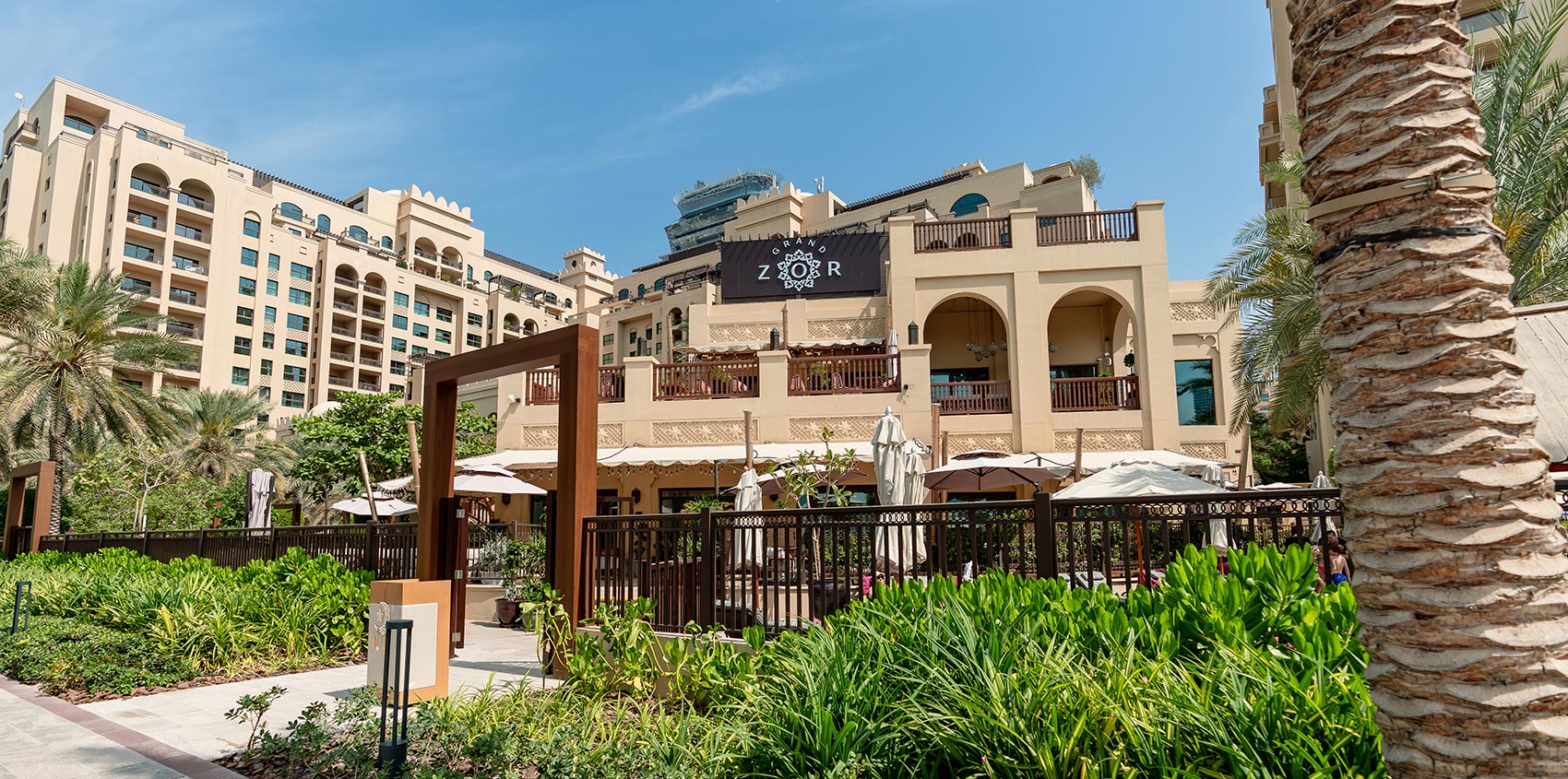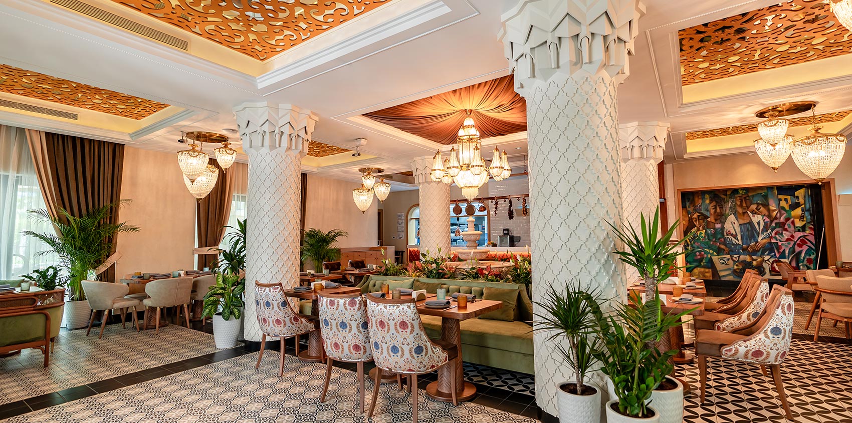 Grand ZOR at Fairmont The Palm is a stand-alone, fully licensed restaurant created as a complete dining and lifestyle destination. With its own private entrance from West Beach, along with both valet and self-parking options, the venue offers easy and direct access while remaining seamlessly connected to the Fairmont setting. Located on the ground floor, the restaurant opens onto a spacious terrace overlooking the marina, surrounding greenery, and Dubai’s skyline, making it ideal for daytime dining and relaxed evenings. Inside, the atmosphere is warm and immersive, shaped by hand-painted walls, intricate mosaic details, flowing fountains, and richly layered interiors inspired by Uzbek culture. Guests arriving from the self-parking side are welcomed by a striking 3D-effect painted photo wall, creating a memorable visual moment. The venue is also family-friendly and hosts regular kids’ cooking masterclasses, while adults can enjoy the upstairs lounge with its distinctive design and one of the top shisha experiences in the UAE. A small outdoor stage adds character to the space with occasional live performances. The menu blends Uzbek cuisine with Mediterranean and Eastern European influences, offering a large and generous selection designed for sharing, including Uzbek osh, lagman, delicious flavors of samsa, chuchvara, manti, and a wide variety of shashliks, all served in a setting where time tends to slow down naturally.